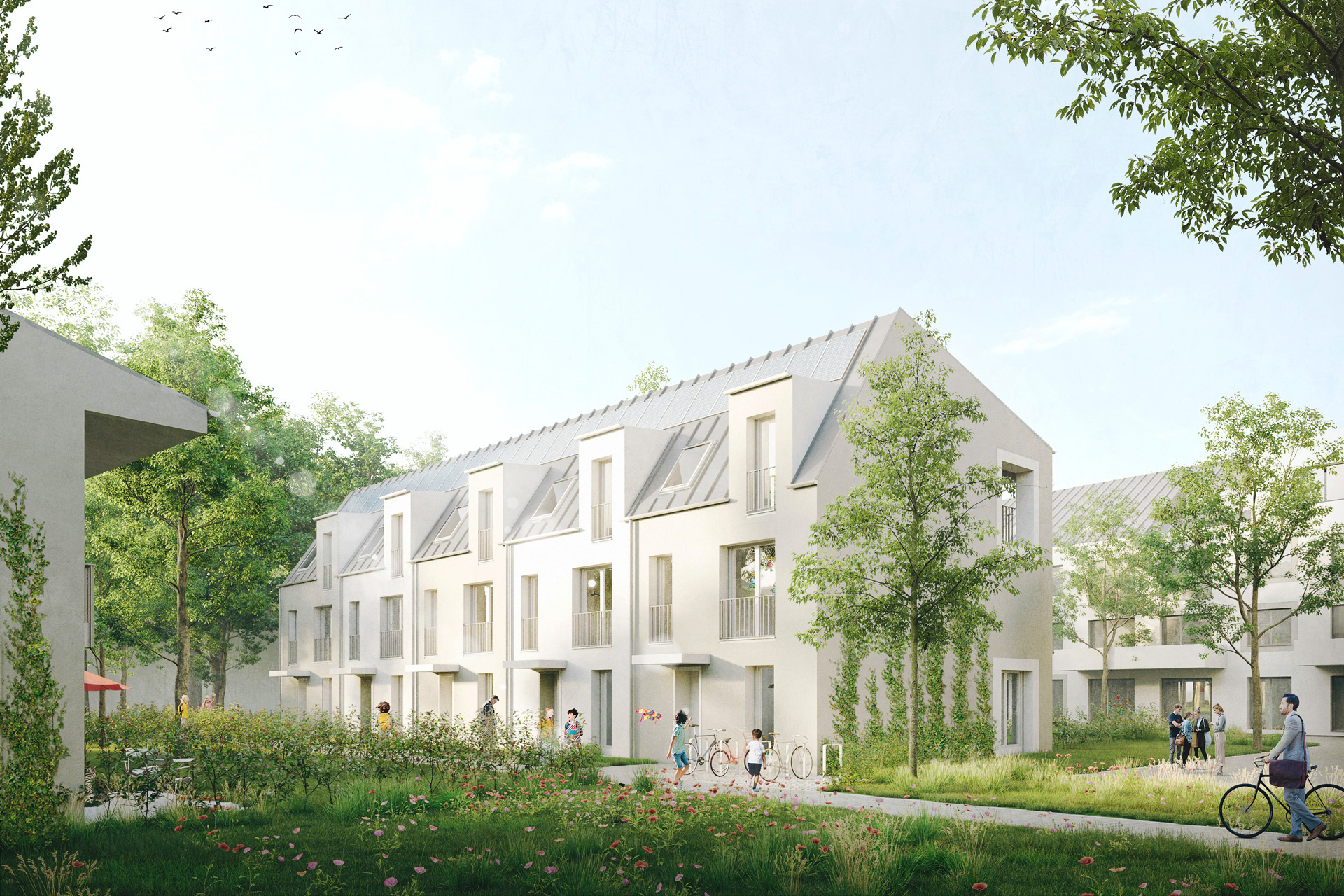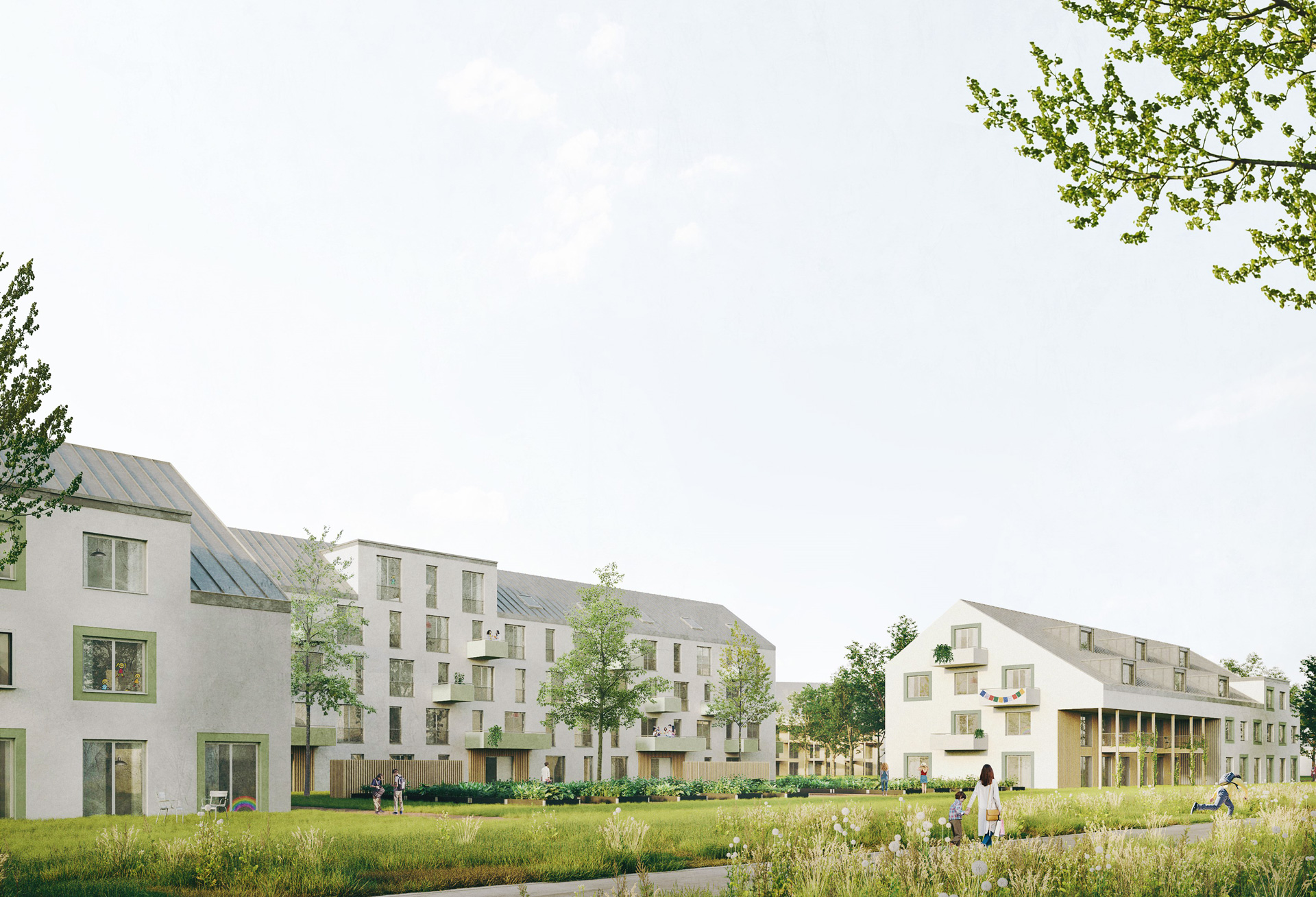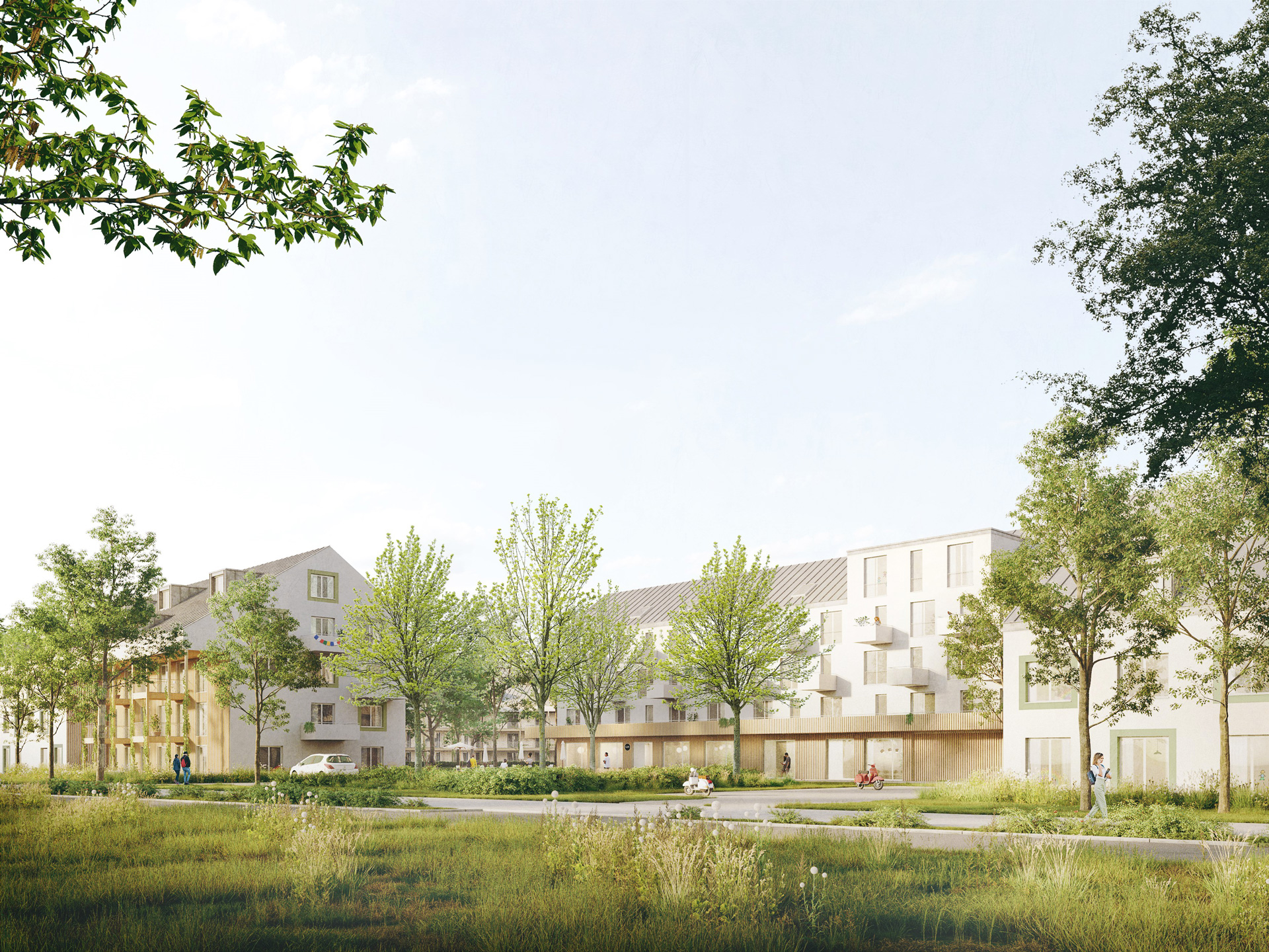 - Autoarmes Wohnquartier mit Mix aus Geschosswohnen und Reihenhäusern
