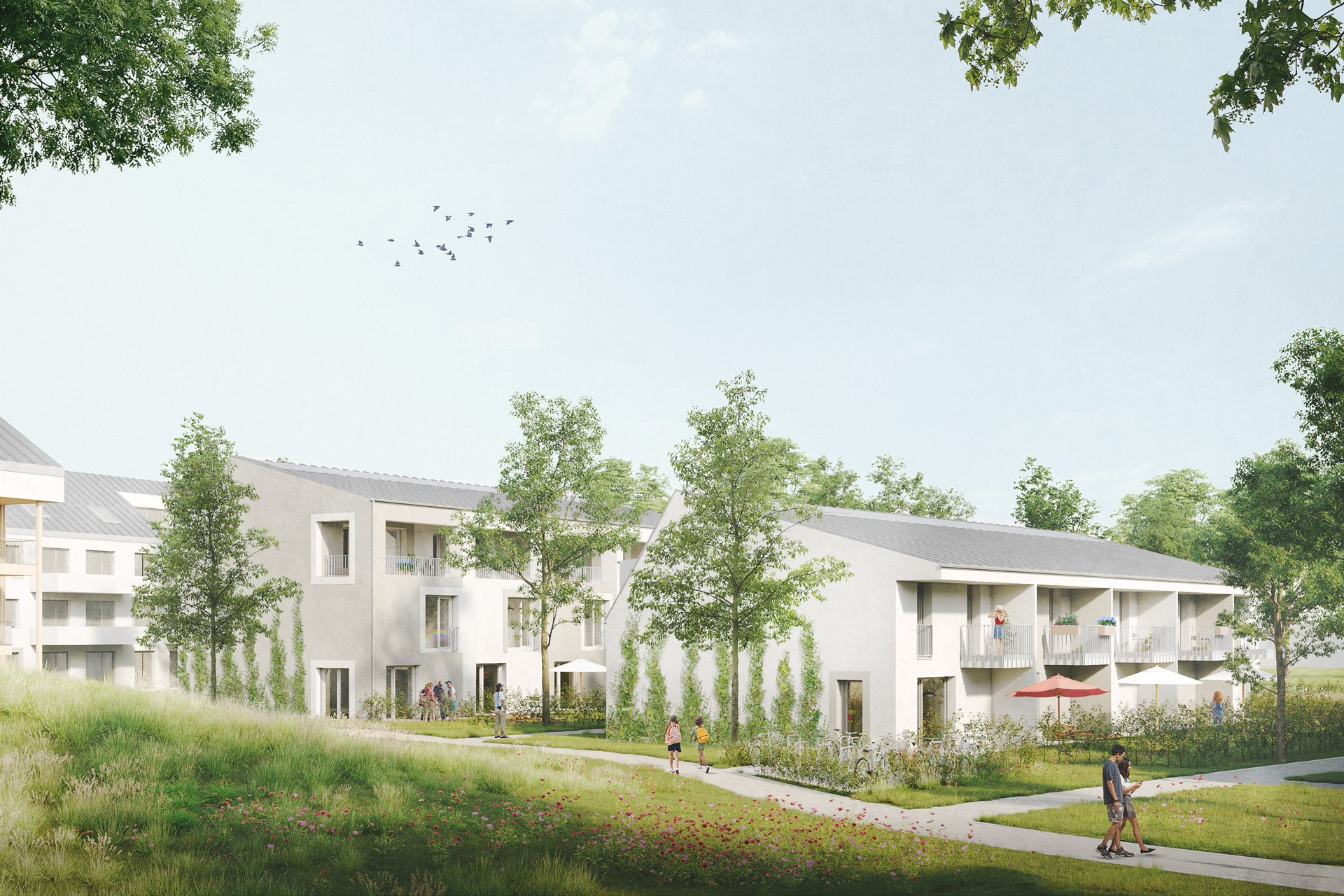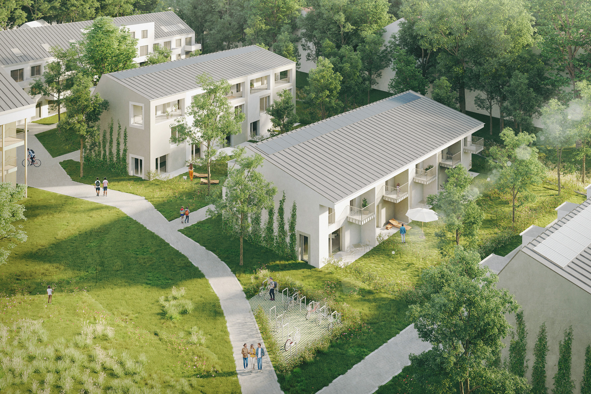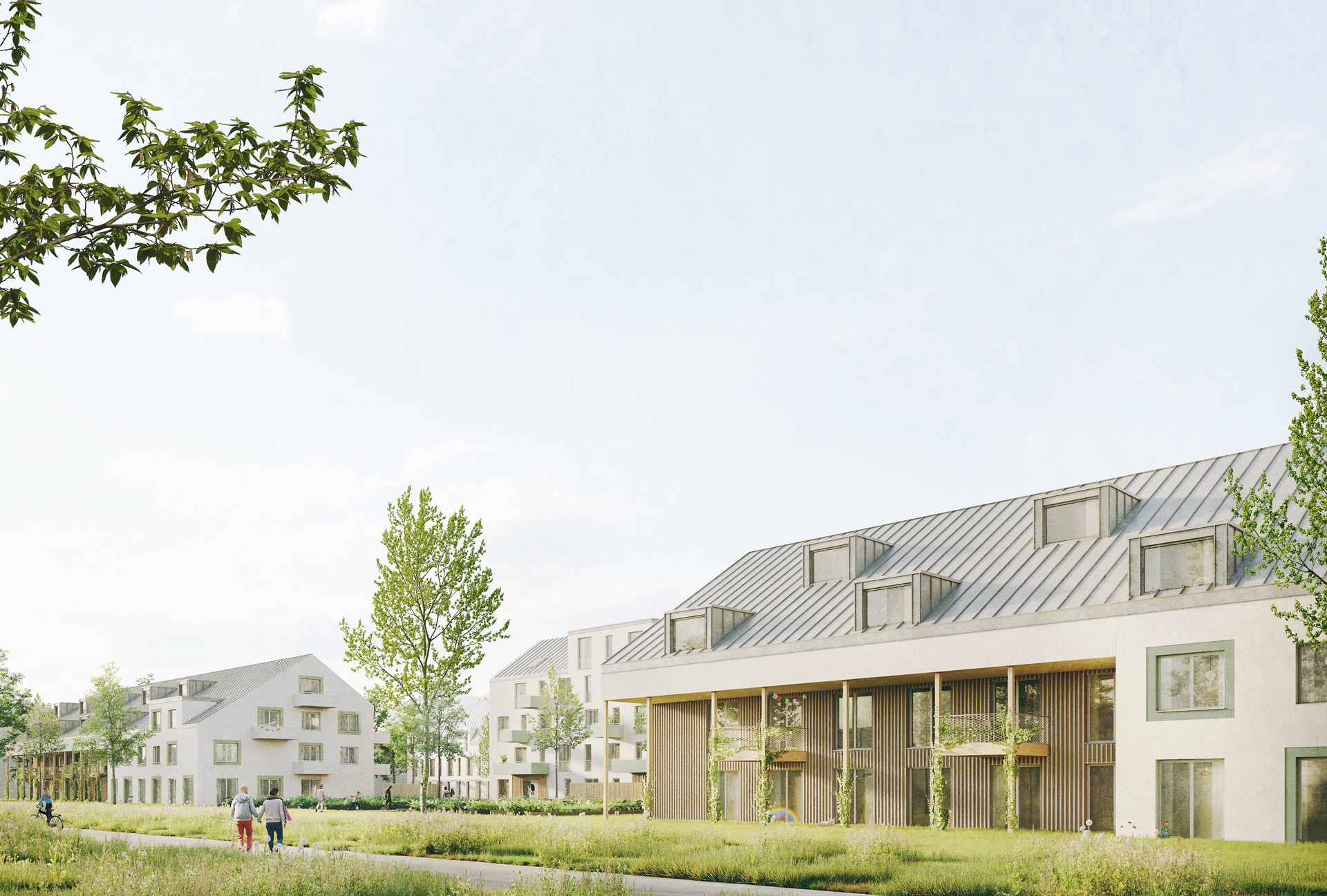 - Autoarmes Wohnquartier mit Mix aus Geschosswohnen und Reihenhäusern